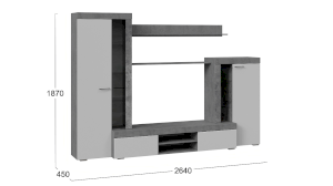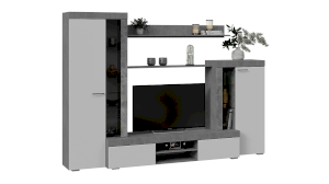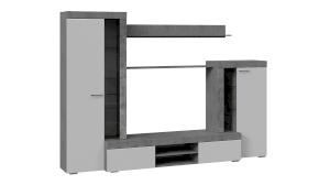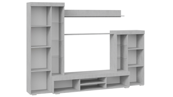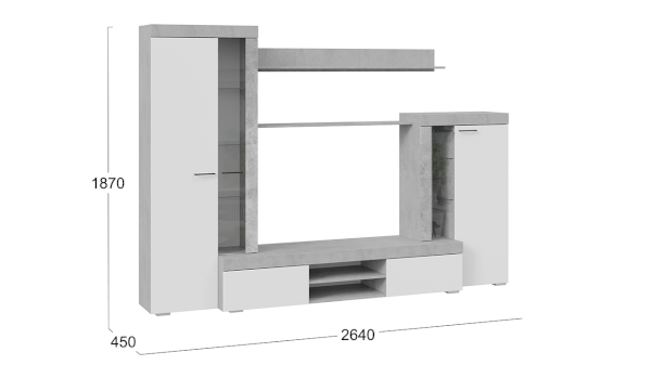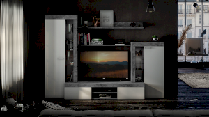 Сочетание белых фасадов, черной лицевой фурнитуры и каркасов в текстуре «Цемент светлый» способно освежить и преобразить комнату, придать интерьеру вашей гостиной современный, благородный вид.